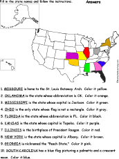 US States Map #2: Follow the Instructions Fill in 10 state names given clues and then color part of a US map according to the directions, such as, "______ is nicknamed the "Peach State." Color it pink." States: Florida, Georgia, Kansas, Illinois, Mississippi, Missouri, New York, Ohio, Oklahoma, South Carolina. Or go to the answers. |