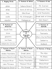 Write Geography Words by Category Write geography words by category (write 5 words per category). The categories include: Mapping Words, Features of Africa, Features of Asia, Features of Australia, Features of Europe, Features of North America, Features of South America, Features of Antarctica. Or go to sample answers. |
