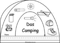 Das Camping Camping Words in German A short book about camping words in German to print for early readers - the book is shaped like a tent. The book has pages for the student to cut out, camping gear to color, and German words to copy. The camping words include Zelt/tent, Lagerfeuer/campfire, Taschenlampe/flashlight, Schlafsack/sleeping bag, Rucksack/backpack, Wanderschuhe/hiking boots, Kompass/compass, Wasserflasche/water bottle, and Kanu/canoe. |