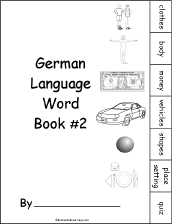German Word Book #2 A Printable Activity Book A short, printable activity book in German/English (with tabs), with pages on clothes, the body, money, vehicles, shapes, and a place setting - plus a quiz. |