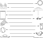 Beach Words in German Label the beach words in German, including sun, sand castle, beach umbrella, beach towel, sunglasses, popsicle, sun block, beach ball, shell, sun hat. Answers |
