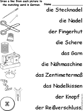 Match German Sewing Words and Pictures Match 10 German sewing words to their pictures. The words are: Nadel/needle, Stecknadel/pin, Fingerhut/thimble, Schere/scissors, Garn/thread, Nähmaschine/sewing machine, Zentimetermaß/tape measure, Nadelkissen/pin cushion, Knopf/button, Reißverschluss/zipper. Or go to the answers. |