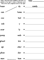 Match the Syllables: Halloween Words Match the syllables to make 10 Halloween words. The words are candy, costume, haunted, ghostly, cobweb, pumpkin, monster, spider, phantom. Or go to the answers. |