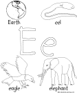 | Letter E Printout The printable page has a capital letter, a lower case letter, and four words that start with E, with pictures of the words to color. |
