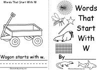 Words That Start With W A Printable Activity Book A short, printable book about simple words that start with W -- for early readers. The book has pages for the student to assemble, objects to color, and short phrases to copy (like "Wall starts with w."). The words include: wagon, walk, wall, wallet, walnut, walrus, wand, wasp, watch, water, watermelon, we, weasel, web, whale, and worm. |