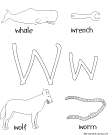 | Letter W Printout The printable page has a capital letter, a lower case letter, and four words that start with W, with pictures of the words to color. |