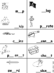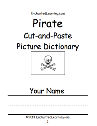 Pirate Cut-and-Paste Picture Dictionary - A Book to Print. Color, cut and paste the pictures in the right places. Then write the words under the pictures. Cut out each page and staple them together (in the right order) to make a tiny book. Words: anchor, cannon, chest, coins, map, parrot, pirate, hook, ship, sword, and write another pirate word.