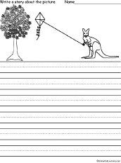 Tree, Kangaroo, and Kite' Write a story about the picture. The picture shows a kangaroo flying a kite near a tree. |