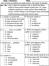 Conifer Definition Quiz: A Printable Worksheet Multiple choice comprehension questions about the word conifer. Read the dictionary definition and sample sentence, then answer the questions. Go to the answers. Or go to a pdf version. |
