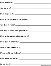 Fruit: Describe It! Worksheet Write the name of a type of fruit, then answer questions about how you would describe it. |