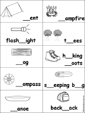 Missing Letters in Camping Words Find the missing letters in camping words, and then color the picture of the word. The words are tent, campfire, flashlight, trees, log, hiking boots, compass, sleeping bag, canoe, and backpack. |