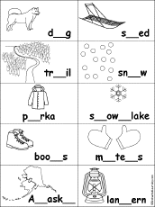 Missing Letters in Iditarod Words Find the missing letters in Iditarod words, and then color the picture of the word. The words are dog, sled, trail, snow, parka, snowflake, boots, mittens, Alaska, lantern. |