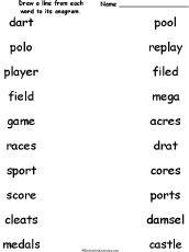 Match the Sports Anagrams Draw a line from each sports-related word to its anagram. Words: dart/drat, polo/pool, player/replay, field/filed, game/mega, races/acres, sport/ports, cleats/castle, medals/damsel. Or go to the answers. |