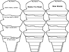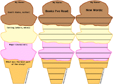 3 Ice Cream Cone Bookmarks Print 3 different bookmarks picturing ice cream cones. Write a mini book report, list books recently read, and list new words found in the book. |