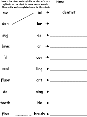 Match the Syllables: Tooth Words Match two syllables to make 10 tooth words. The words are dentist, molar, braces, sugar, decay, filling, sealant, flossing, fluoride, toothbrush. Or go to the answers. |