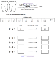 Solve the addition problems, then use the alphabet code to solve the toothy riddle, "What has many teeth but cannot eat?" Answer: "A comb." Or go to the answer page. |