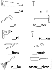 Missing Letters in Tools Find the missing letters in tool words, and then color the picture of the word. The words are saw, nail, ax, hammer, drill, screw, pliers, wrench, rake, screwdriver. |