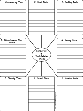 Write Tool Words by Category Write 5 tool words for each category. The categories include: Woodworking Tools, Hand Tools, Cooking Tools, Sewing Tools, Garden Tools, School Tools, Cleaning Tools, What Tools Do. Or go to sample answers. |