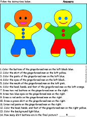 Gingerbread Men: Follow the Instructions Draw and color the gingerbread men according to simple directions, such as, "Draw a red smile on the gingerbread man on the right." Or go to the answers. |