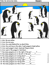 Penguin: Follow the Instructions Color and count the penguins according to simple directions, such as, "How many penguins are facing right?" Or go to the answers. |