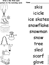 Match Winter Words and Pictures Match 10 winter words to their pictures. The words are: skis, icicle, ice skates, snowflake, snowman, tree, sled, scarf, and glove. Or go to the answers. |