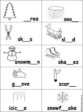 Picture Cloze for Winter Words - Printable Worksheet Fill in the missing words in the text given a picture prompt, using the winter word bank. The words are: glove, icicles, scarf, skate, skies, sled, snow, snowflakes, snowman, tree. Go to the answers. |