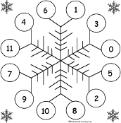 Snowflake Bingo Play snowflake bingo with the numbers 0-11. Print snowflake bingo cards with numbers on the snowflakes and then call out numbers (or use simple math problems that have answers from 0-11). |