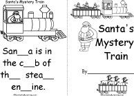 Santa's Mystery Train Printable Book A short, printable Christmas book for early fluent readers with fill-in-the blanks on each page. The pages are: Santa is in the cab of the steam engine. Elves are shoveling coal in the coal tender. Reindeer are riding in the cattle car. Candy canes are packed in the boxcar. Carolers are singing in the observation car. Gingerbread cookies are baking in the dining car. Snowmen are melting in the coach car. Gifts are hidden in the baggage car. The tree is in the red caboose. |