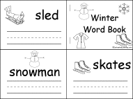 Winter Words Mini Book A Printable Writing Book A tiny, printable book about simple words related to winter-- for early readers and writers. The book has 2 pages to print and makes 8 pages for the student to cut out, color, and write in. The words are: sled, snowman, skates, snowflake, coat, icicle, and "Can you think of another winter word?" |