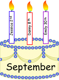 Monthly Birthday Cake Printouts Print a bulletin board cake for each month of the year and a candle for each student. Cut them out and post the 12 cakes on the bulletin board. Write a student's name on each candle and place each candle on the birth month. |