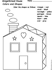 Gingerbread House Coloring Printable: Colors and Shapes Color the gingerbread house by following instructions about the shapes. Color it as follows: triangle - red, circle - black, rectangle - yellow, pentagon - brown, square - blue, heart - pink, oval - gray. |