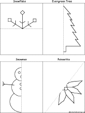 Symmetrical Winter Pictures: Finish the Drawing Worksheet Finish each of the four drawings around the line of symmetry. The winter pictures are a snowflake, evergreen tree, snowman, and poinsettia. Or go to the answers |