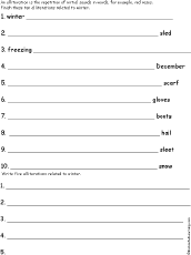 ![]() Words About Winter A Worksheet to Print A short, printable worksheet quiz about weather. The short-answer worksheet asks 10 questions about winter, for example, "What is your favorite winter holiday (and why)?" Or go to a pdf of the page (subscribers only). |