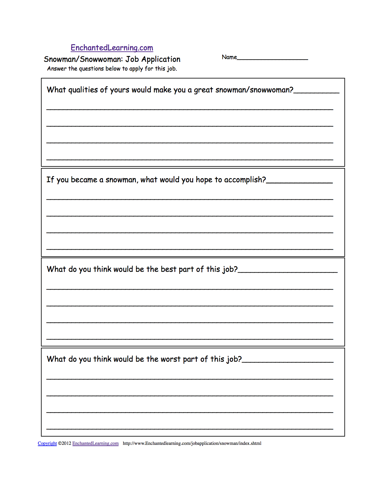 ![]() Snowman: Job Application Answer the questions below to apply for this job as a snowman/snowwoman. Or go to a pdf of the worksheet. |