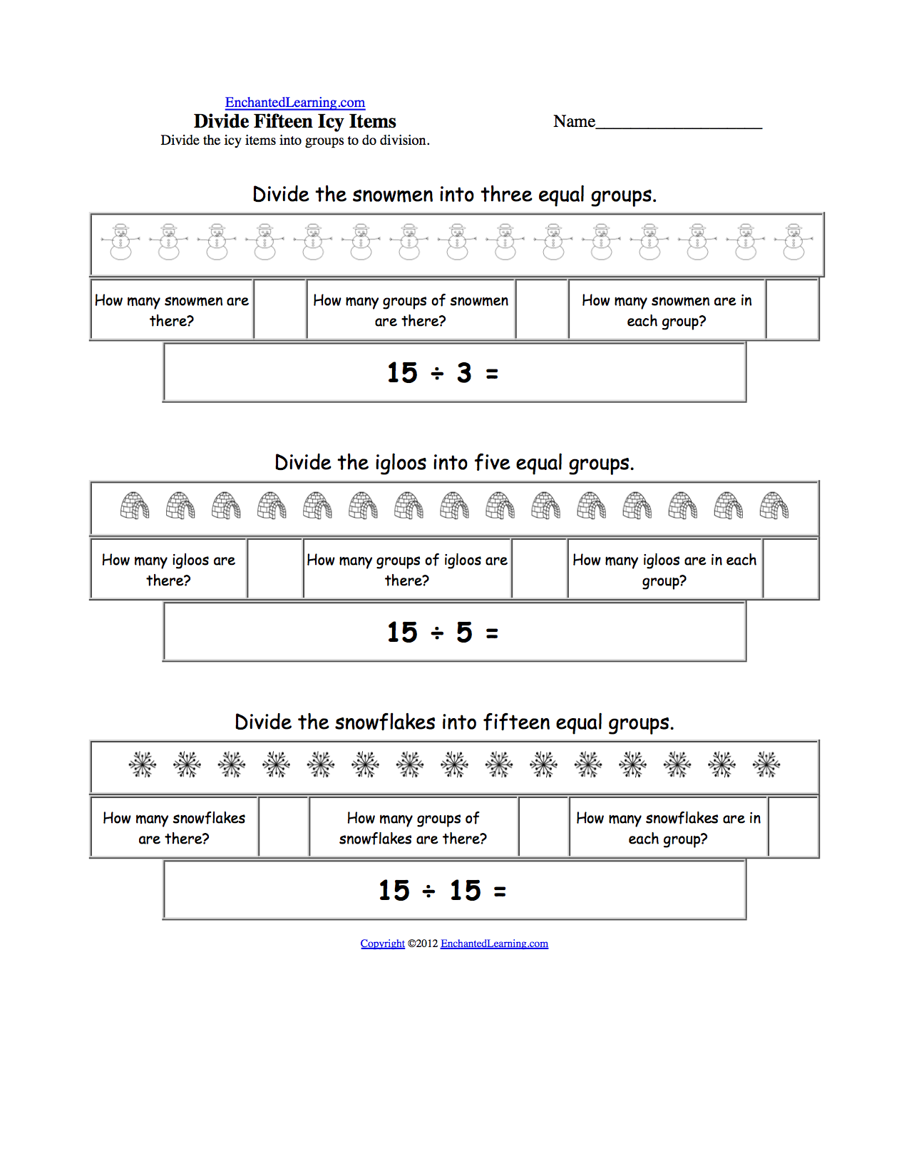 ![]() Divide Fifteen Icy Items by 3, 5, and 15 Divide 15 snowmen into 3 equal groups (15÷3=5), divide 15 igloos into 5 groups (15÷5=3), then divide 15 snowflakes into 15 groups (15÷15=1). Or go to the answers. |