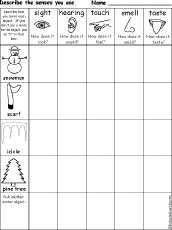 Which Senses Do You Use? Winter Printable Worksheet A printable worksheet on which senses we use to examine objects, with a chart to fill in. Describe how you sense each object. If you don't use a sense for an object, put an "X" in that box. Objects: snowman, scarf, icicle, pine tree, and pick another Winter object. |