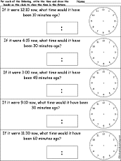 Clock Arithmetic. For each of the clocks, write the time and draw the clock hands to tell the past time as indicated."
