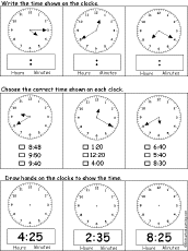 Telling Time Activities. For each of the clocks, write the time, pick the correct time, and draw the clock hands to match the time."
