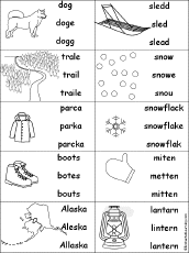 Circle the Correctly-Spelled Iditarod Words Circle the correct spelling of Iditarod-related words, and then color the picture of the words. The words are dog, sled, trail, snow, parka, snowflake, boots, mittens, Alaska, lantern. |