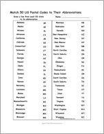 Match 50 US state postal codes to their abbreviations in this printable worksheet.