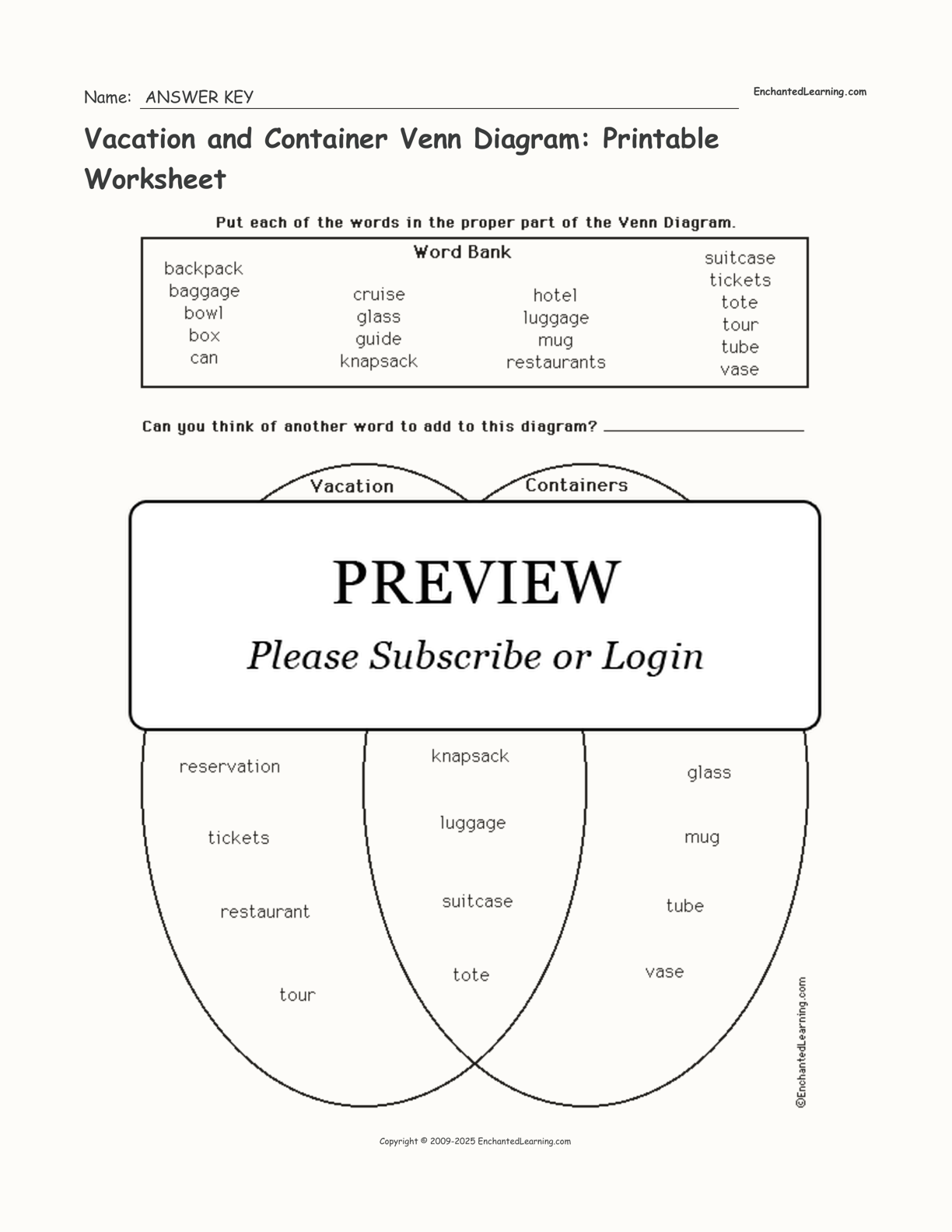 Vacation and Container Venn Diagram Worksheet: Put each of the word bank words in the proper place in the Venn diagram with the headings: vacation, container.