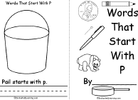 Words That Start With P A Printable Activity Book A short, printable book about simple words that start with P -- for early readers. The book has pages for the student to cut out, objects to color, and short phrases to copy (like "Pan starts with p."). The words include: pail, pan, panda, paper, parrot, pear, pea, pen, pencil, penguin, penny, pet, pig, pin, puppy, and push. May 16, 2004 |