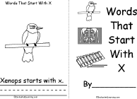 Words That Start With X A Printable Activity Book A short, printable book about simple words that start with X -- for early readers. The book has pages for the student to cut out, objects to color, and short phrases to copy (like "X-ray starts with x."). The words include: xenops, xiphias, x-ray, and xylophone. May 17, 2004 |