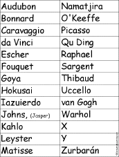 Find an Artist for Each Letter See if you can think of and write down an artist that starts with each letter of the alphabet. Find an artist's name for as many letters as you can. Or go to a sample answer page. February 13, 2005 |