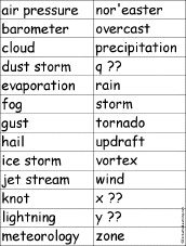 Find a Weather-Related Word for Each Letter See if you can think of and write down a weather-related word for each letter of the alphabet. Or go to a sample answer page. February 13, 2005 |