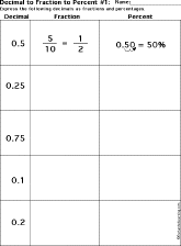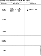 | Express Percents as Fractions and Decimals Each worksheet has percentages to convert to decimals and fractions. Worksheet #1 --- Go to the answers. Worksheet #2 --- Go to the answers. Worksheet #3 --- Go to the answers. Worksheet #4 --- Go to the answers.