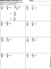 | Subtracting Fractions With the Same Denominators Subtract the fractions (they have the same denominators). Worksheet #1 --- Go to the answers. Worksheet #2 --- Go to the answers. Worksheet #3 --- Go to the answers.