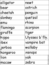 Zoo Animals for Each Letter See if you can think of and write down zoo animals for each letter of the alphabet. Or go to a sample answer page. May 3, 2005 |