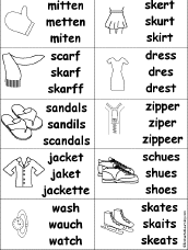 Circle the Correctly-Spelled Clothing Words #2 Circle the correct spelling of words for clothing, and then color the picture of the words. The words are zipper, skirt, watch, jacket, mitten, sandals, sneakers, scarf, skates, dress. May 20, 2005 |