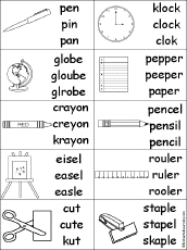 Circle the Correctly-Spelled School Words Circle the correct spelling of school words, and then color the picture of the words. The words are pen, clock, globe, paper, crayon, pencil, easel, ruler, cut, staple. May 20, 2005 |